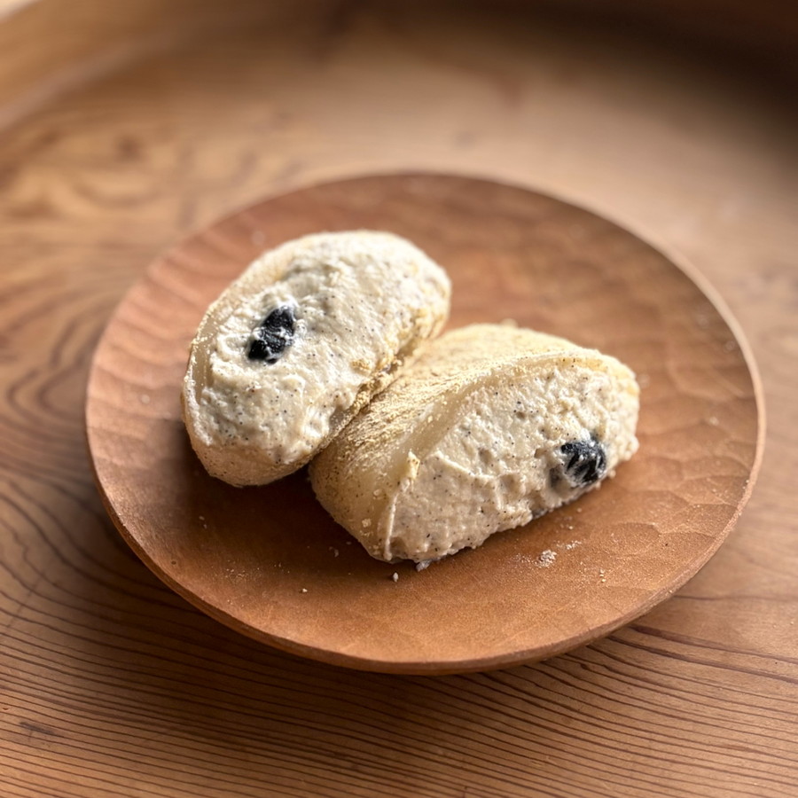 もち生地が少なくて包みづらいかもしれないのですが、生地が薄いと、冷凍して、少し解凍したところでいただくと、アイスクリーム大福にもなります。トレハロースをいれて、冷凍解凍に向くようにしました。