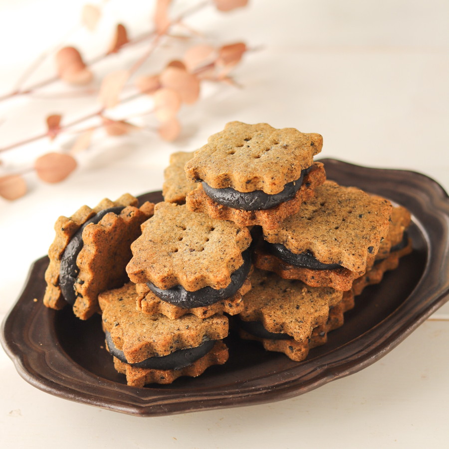 さくっほろ食感の香ばしい黒ごま米粉クッキーで、なめらかな黒ごまバタークリームをたっぷりサンドしました!ごま好きにはたまらないクッキーサンドです♪