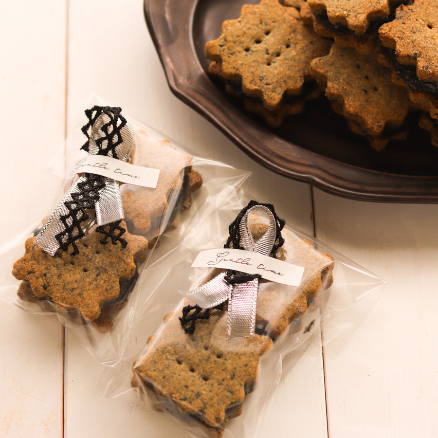 黒ごまバターサンドのクリームがしっかり冷え固まっていることを確認し、袋に2つ入れ、後ろをテープで留める。