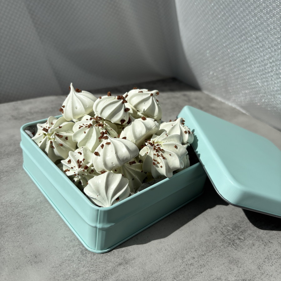 口の中でほわっと溶ける甘いお菓子、メレンゲクッキーを少しアレンジしてミントの風味を加えてチョコミントに仕上げました。甘いけどスゥッとしてたくさん食べてしまうコーヒーのお供です。