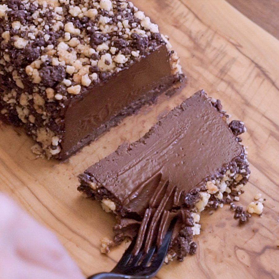 しっかり冷やしておいた7のテリーヌに、14のチョコレートを塗り広げる。
