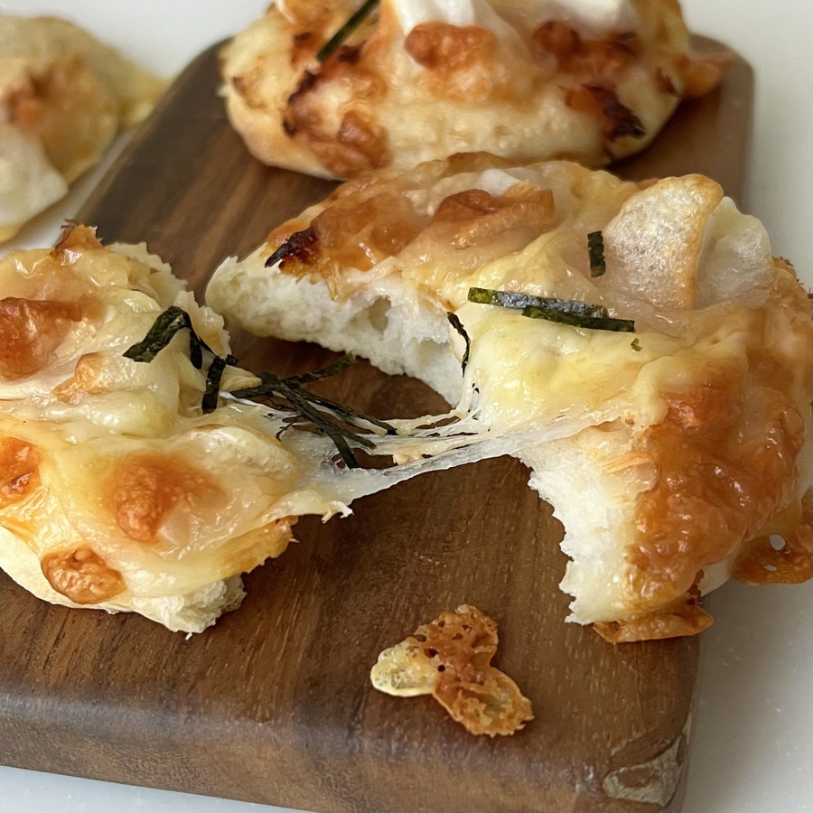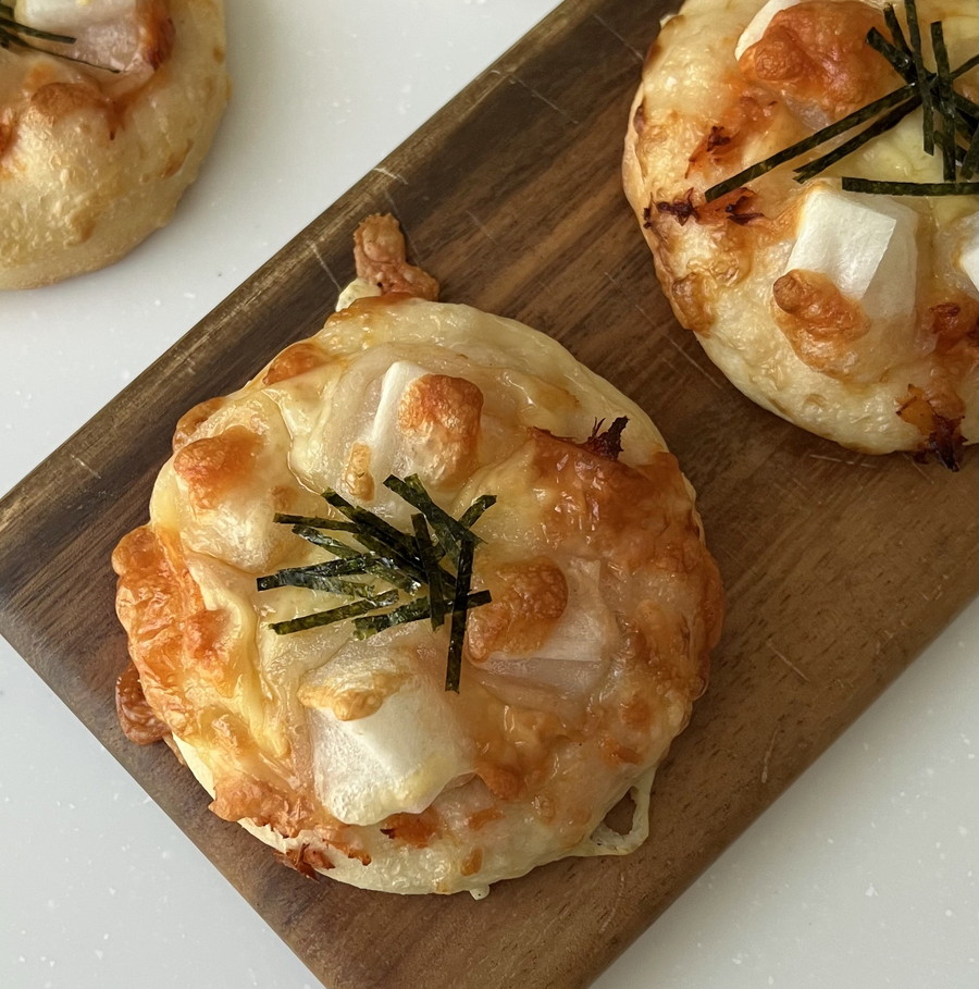 ピザミックスを使ったアレンジレシピ。お餅とチーズがWで伸びる!和風ピザパン。