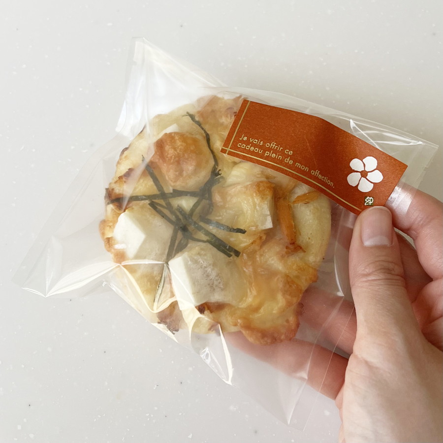 OPP袋にピザを1個入れて、袋の口を後ろに折って封を閉じる。