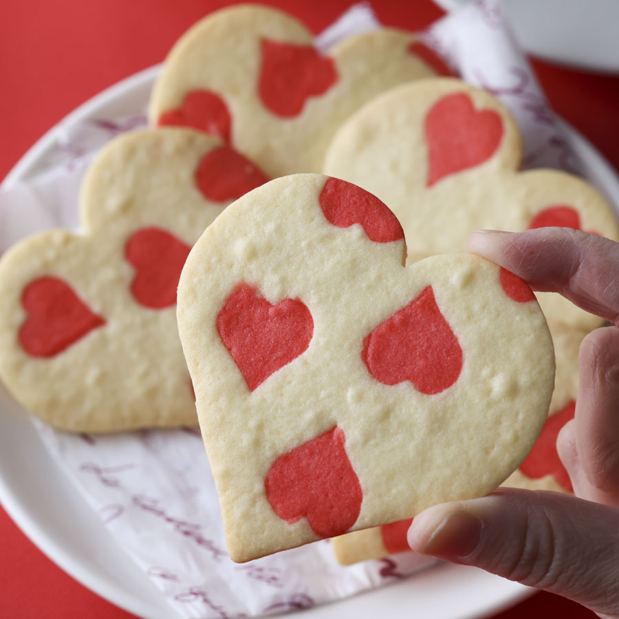 シンプルな材料で作る、赤いハート模様が愛らしい型抜きクッキー。