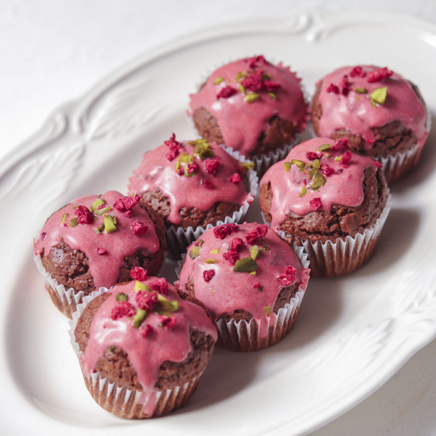 粗熱の取れた4のマフィンにティースプーンなどを使って5のストロベリーチョコをかける。