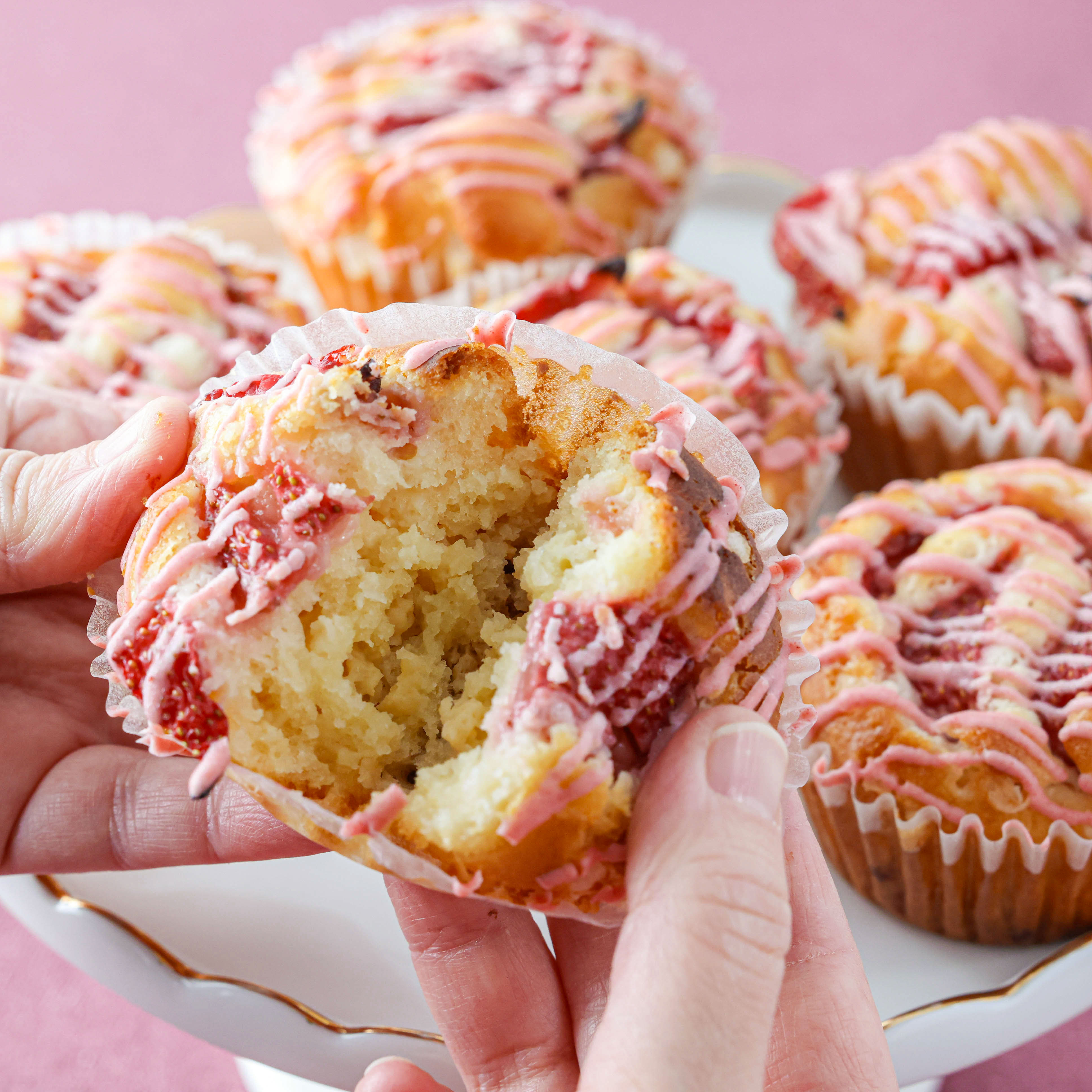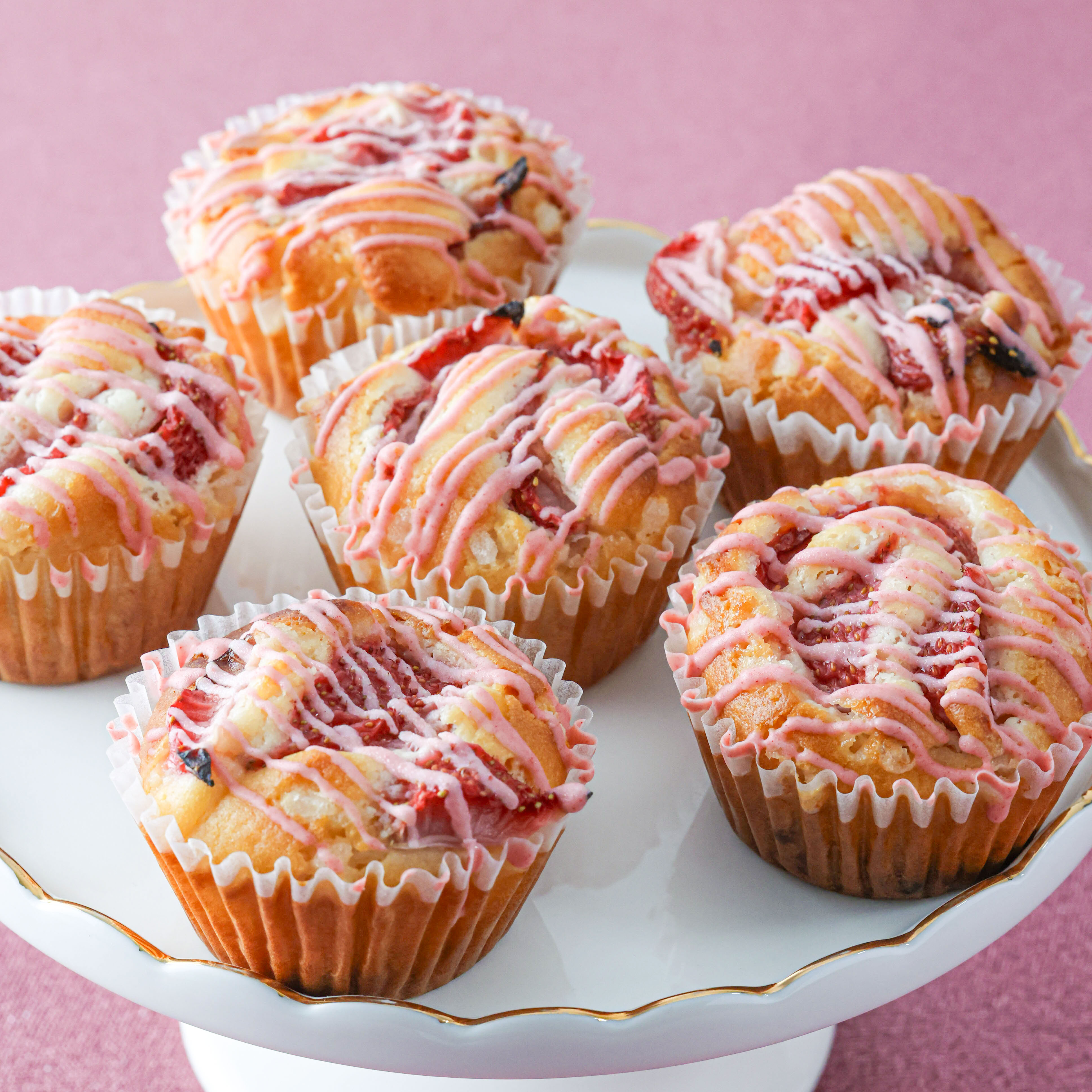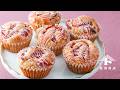 フレッシュないちごを使った米粉のマフィン。生地にホワイトチョコチップを混ぜ込んでいるため、どこを食べても優しいホワイトチョコレートの風味が広がります。