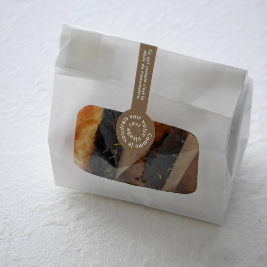 ドーナツを立て、間にシートを挟むようにして袋に入れる。