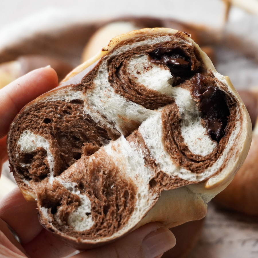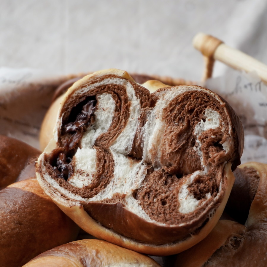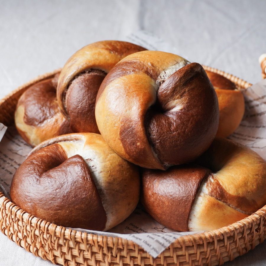 ココア生地とプレーン生地を効率よく仕込み、きれいなマーブル模様に。ほろ苦さと素朴な甘みが広がる見た目にも楽しいベーグルです。