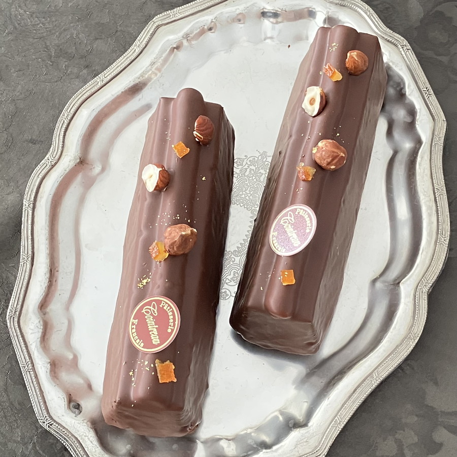 ココア生地にビターなチョコを刻み入れ、ヘーゼルナッツのパウダーを加えることでしっとり、風味よく焼きあがります。仕上げにガナッシュを絞り、全体をミルクチョコでコーティングしましたが、好みでビターチョココーティングにしても。