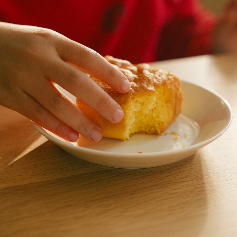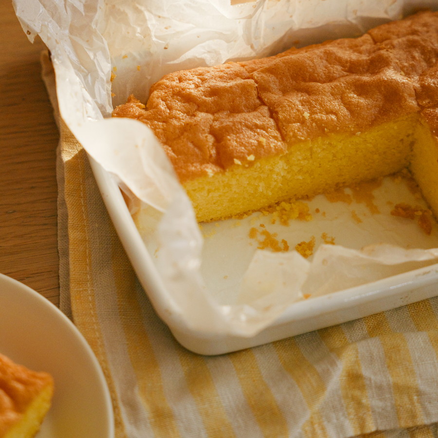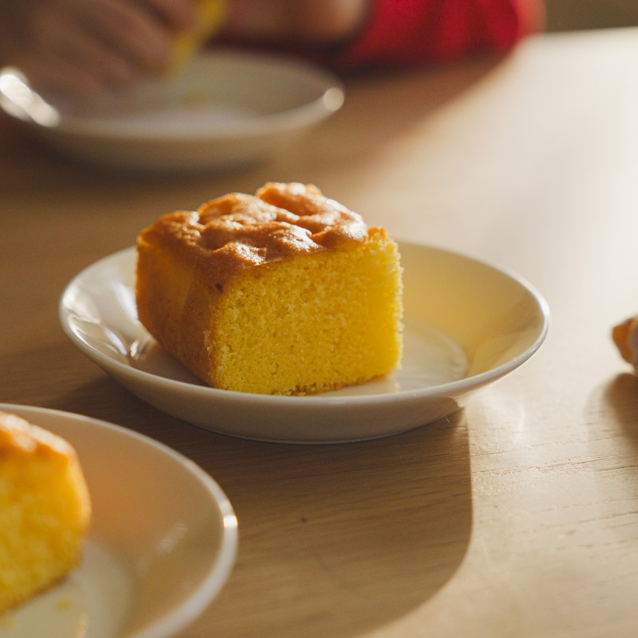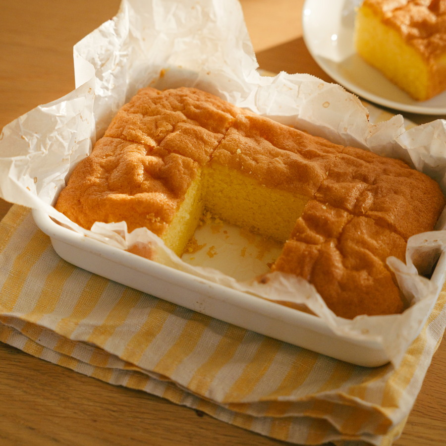 マドレーヌ型を使わなくてもいいから準備も片付けもらくちんで、焼けたらそのままざくっと切り分けるだけ。