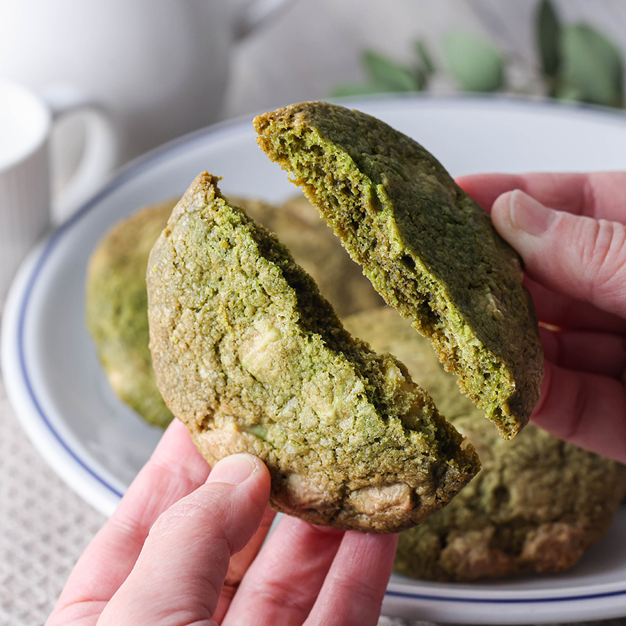 抹茶の風味を生かした軽やかな生地に、ホワイトチョコレートを贅沢に合わせた和テイストのクッキー。
