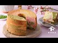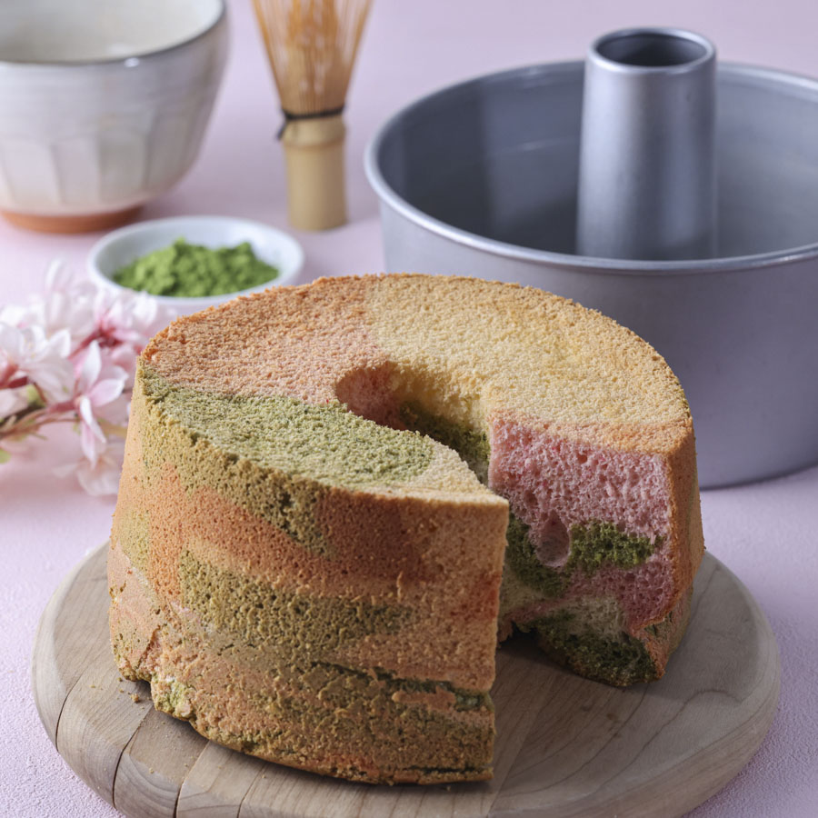 春の香りを楽しめる、桜のピンクと抹茶の緑が美しいふわふわのシフォンケーキ。