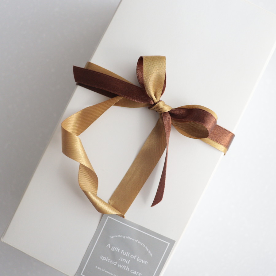 リボンを2色重ねて結び、終わりをねじってシールで留め完成。