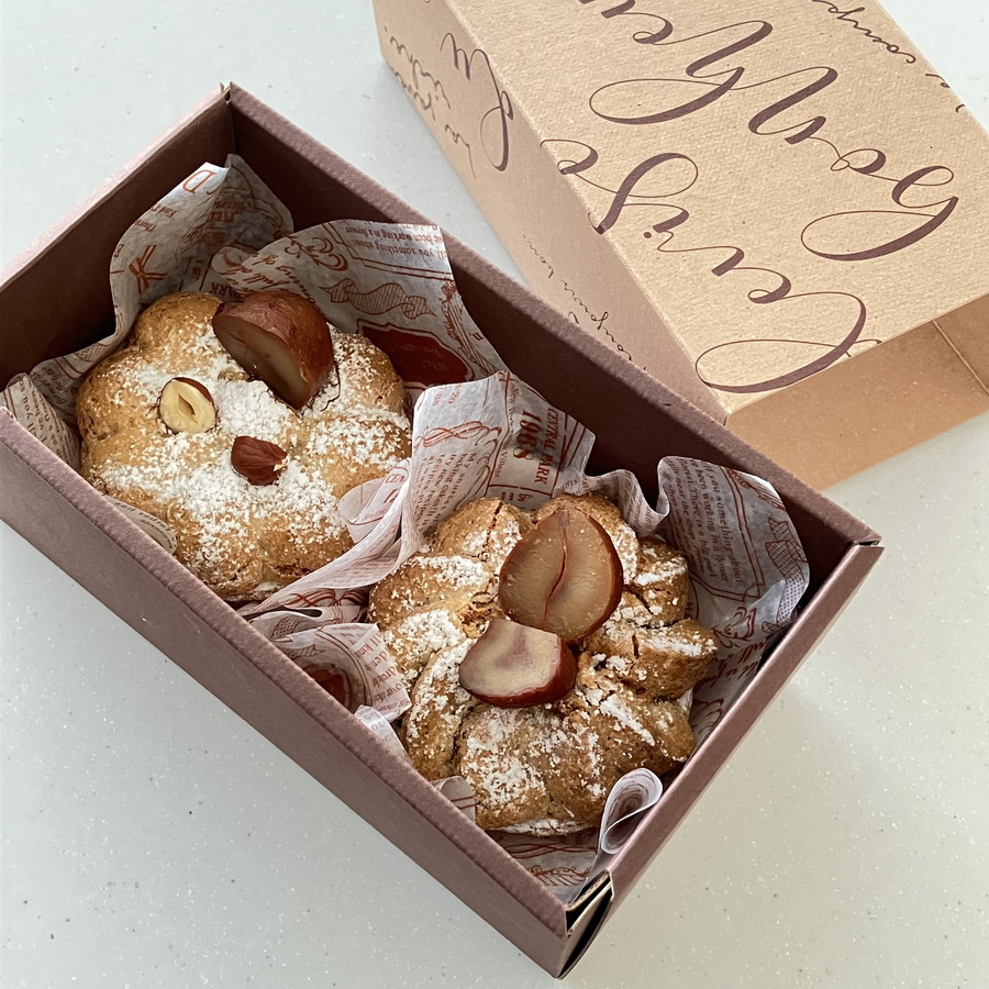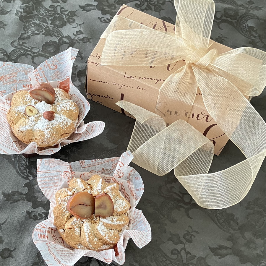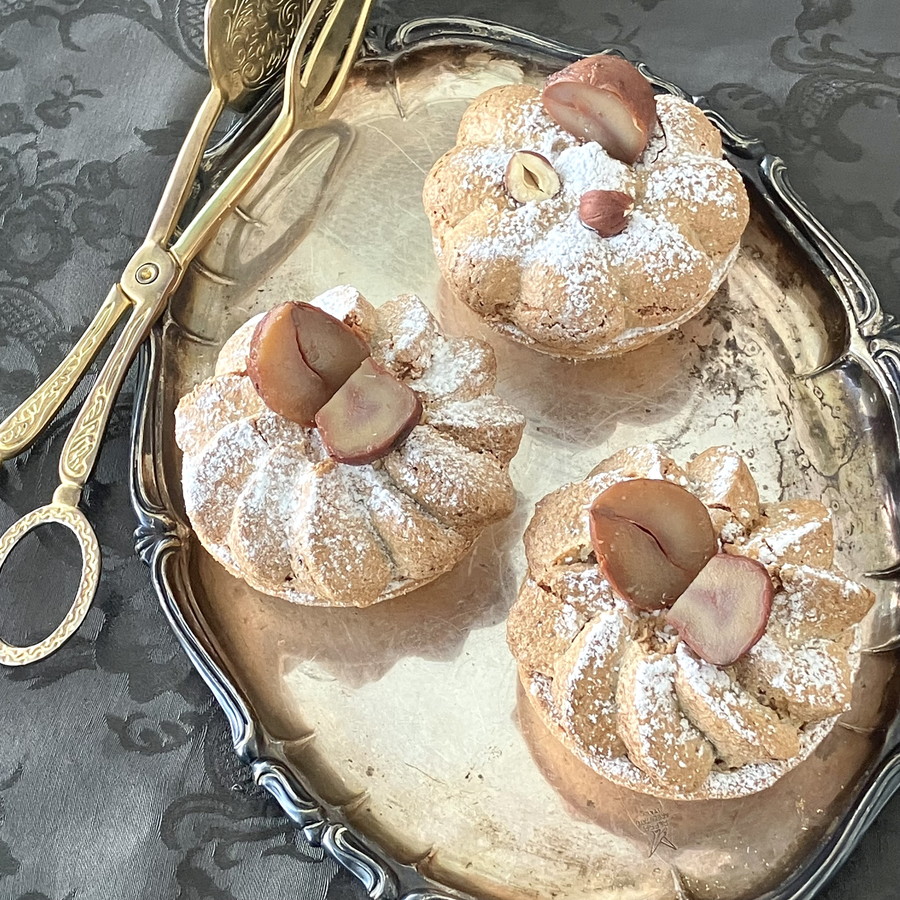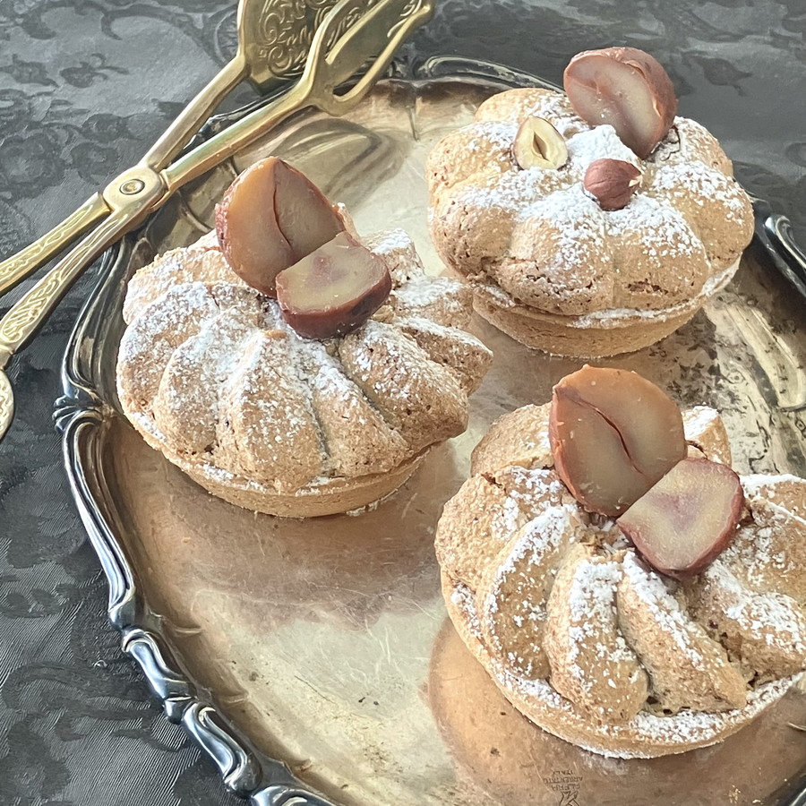 タルトカップにマロンのフィリングをたっふりと詰め、ヘーゼルナッツのダックワーズ生地をトッピングして焼きこんだタルトレットです。