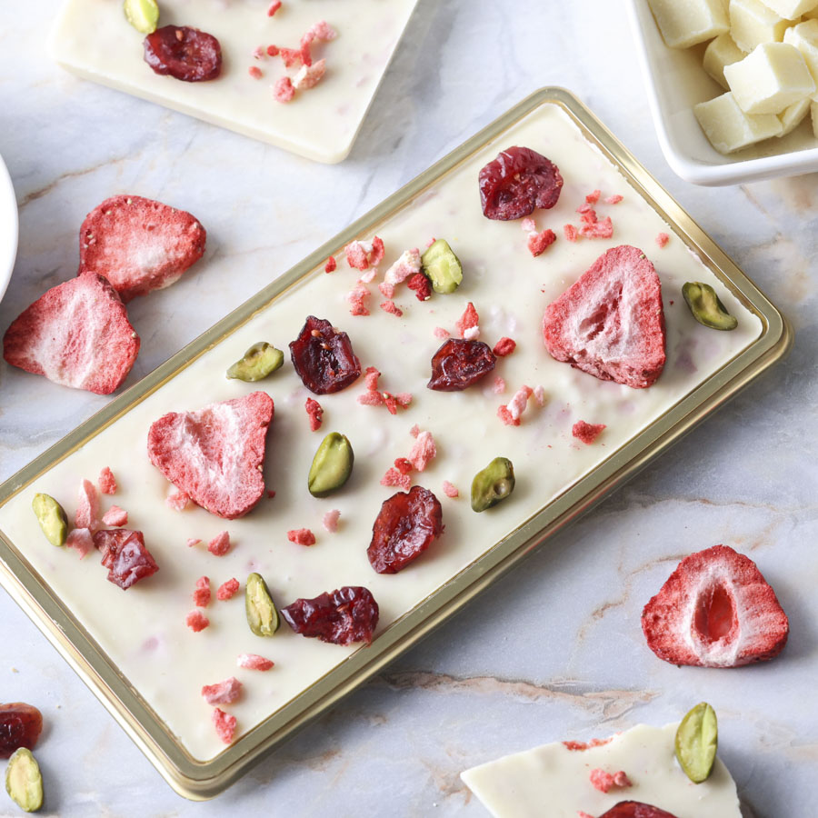 テンパリングがうまくいったら楽しいトッピング!お好みのフリーズドライフルーツやナッツを飾ればオリジナルチョコレートの完成です♪