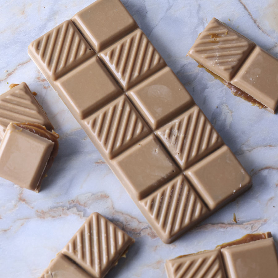 このレシピはテンパリングしたブロンドチョコレートでキャラメルをサンドしたタブレットチョコレート。