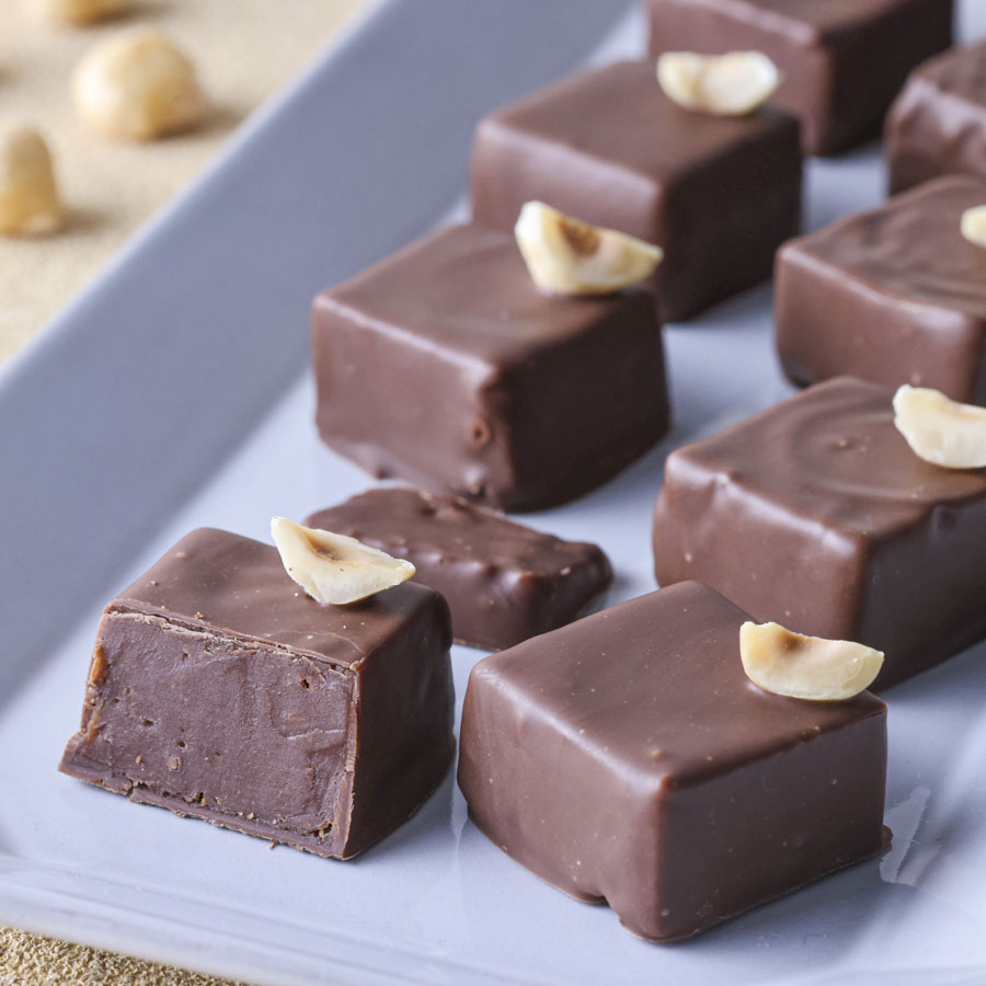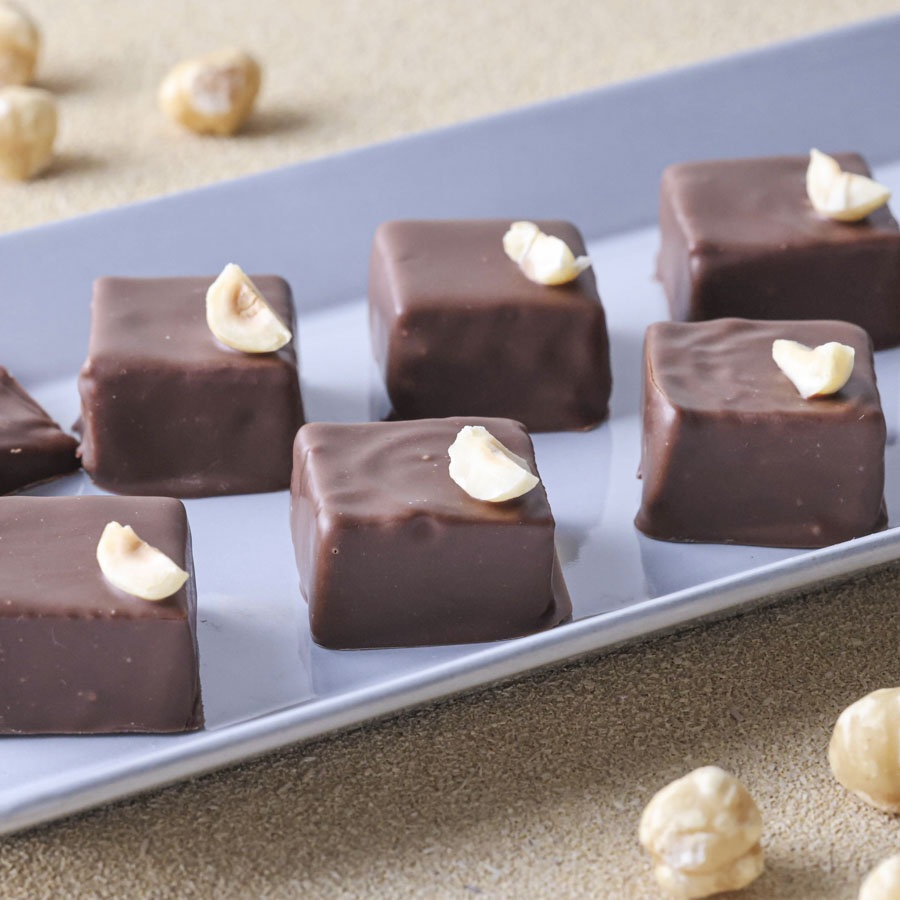 このレシピは柔らかなヘーゼルナッツのガナッシュがとろけるボンボンショコラ。