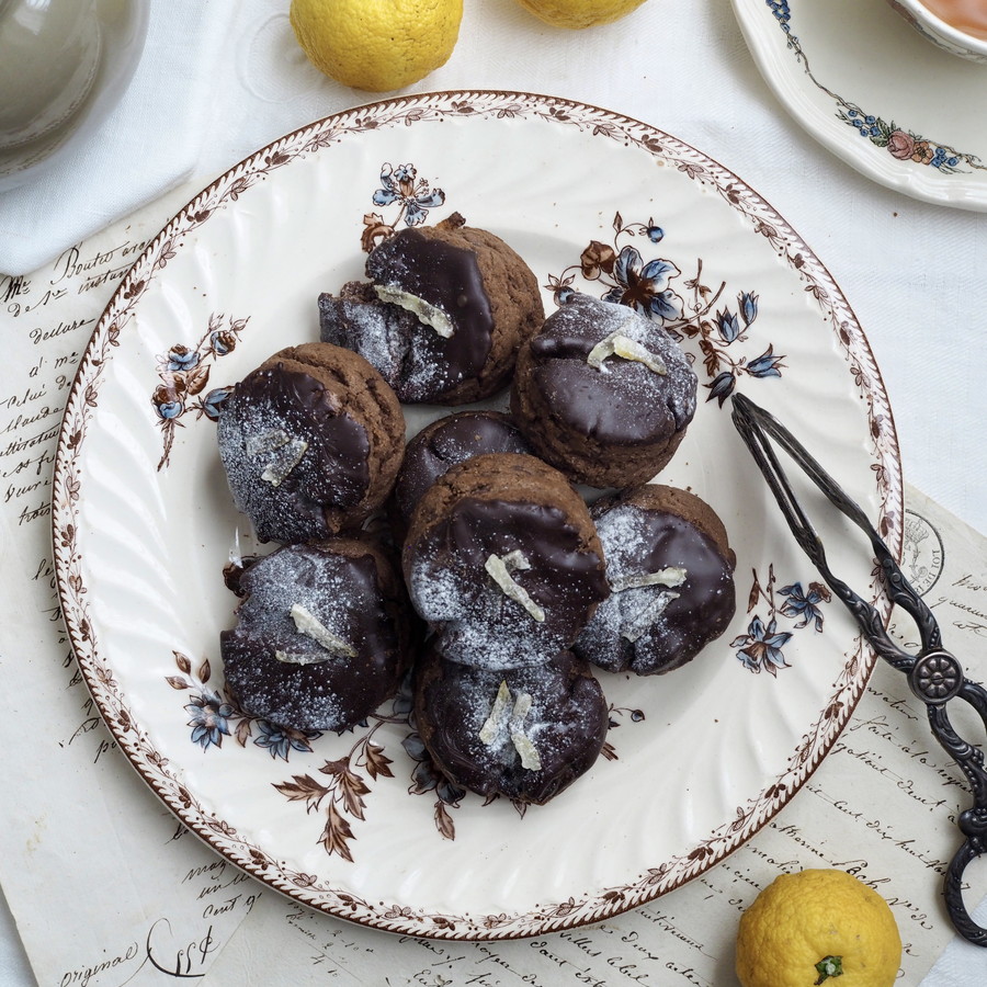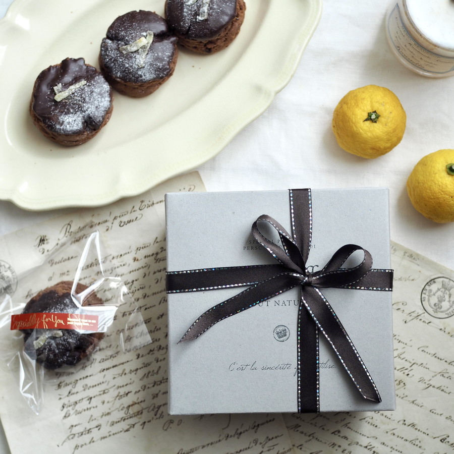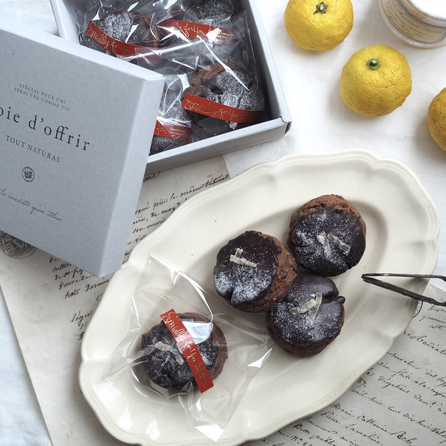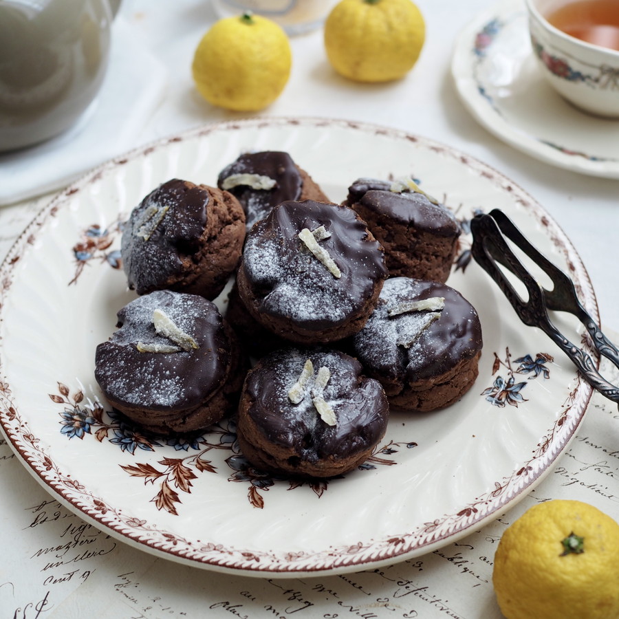 米粉のビターなチョコ生地に柚子をちりばめたスコーンです。