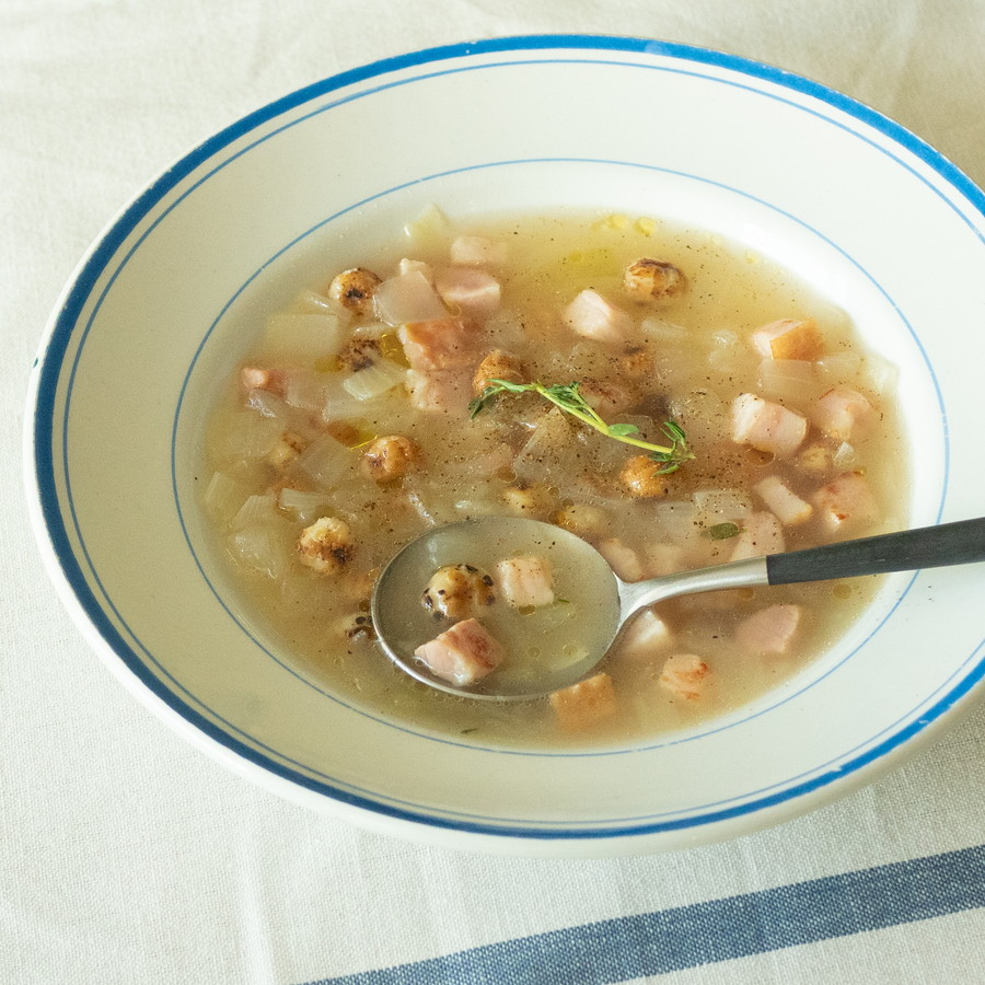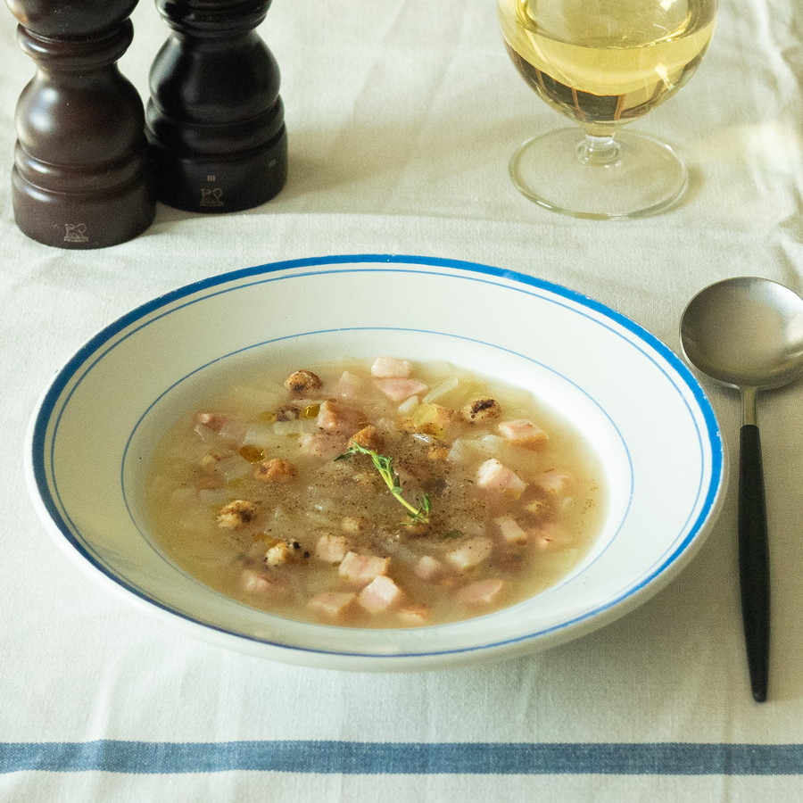 ベーコン、たまねぎと合わせて、食べ応えのあるシンプルなスープをご紹介します。今回はタイムを入れていますが、ローズマリーもおすすめです。