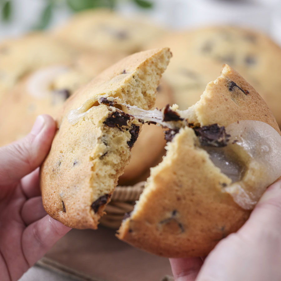火を通してもしっかりともちもち食感が楽しめる冷凍のぎゅうひをチョコチップクッキーで包んで焼き上げました。