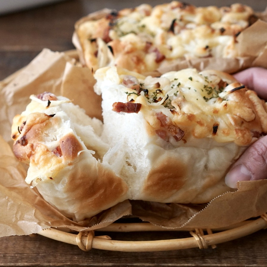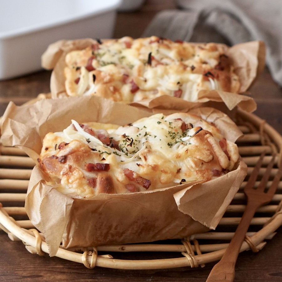 薄くスライスした玉ねぎとベーコン、焼いている時の香ばしい香が食欲をそそります。