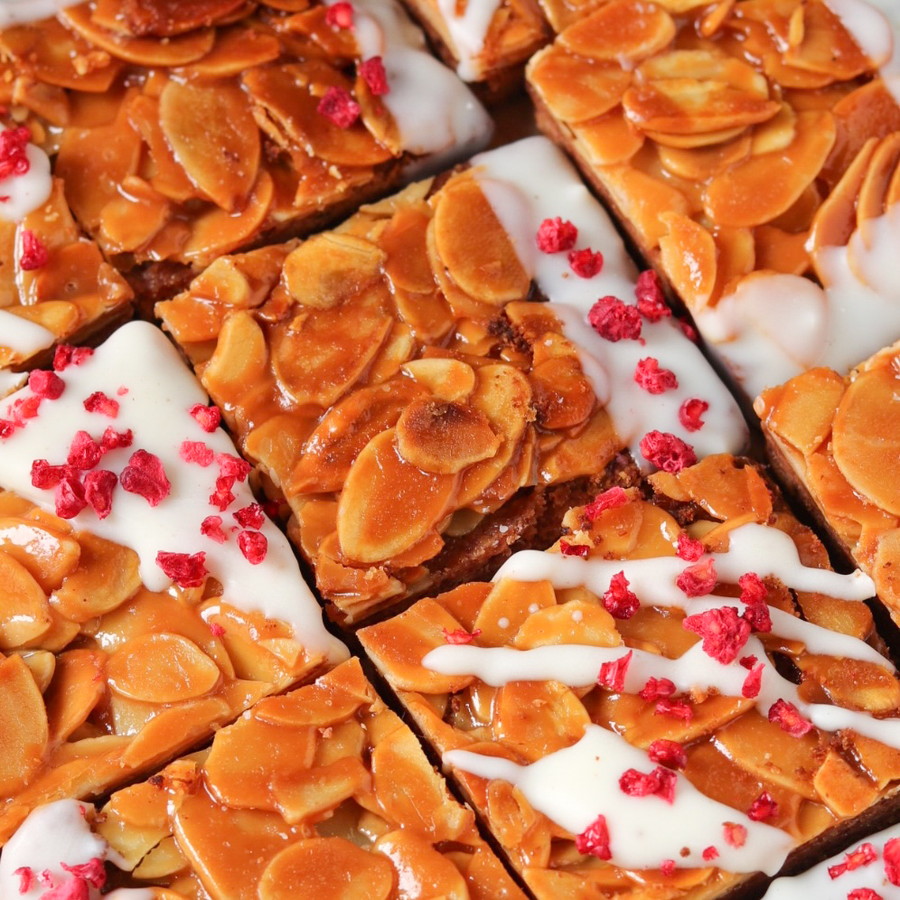 焼きあがったクッキー生地の上に6のキャラメルアーモンドをのせ、180度のオーブンで12~14分ほど焼く。