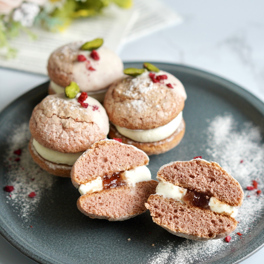 サクふわっとしたいちご味のビスキュイ生地に、チーズベースのクリームをサンドしたブッセです。
