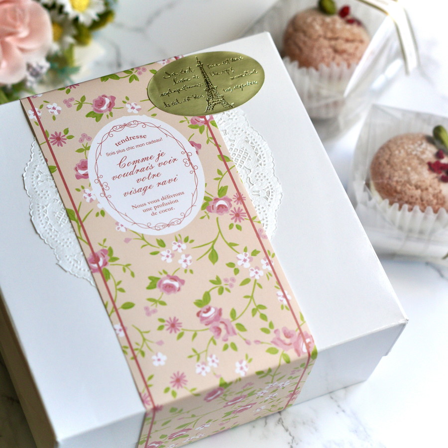 掛け紙の下にレースペーパーを滑り込ませ、ギフトシールで留めて完成。