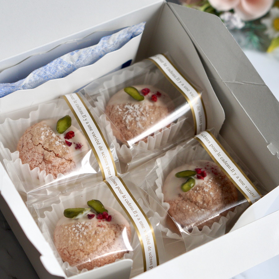 中に忍ばせた甘酸っぱいいちごジャムがアクセントとなっております。ピスタチオとドライフランボワーズのデコレーションで贈り物にもぴったりに仕上げました。