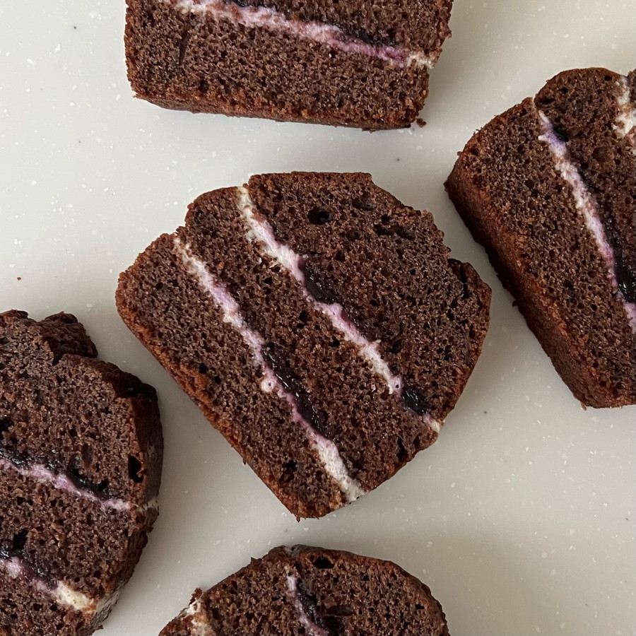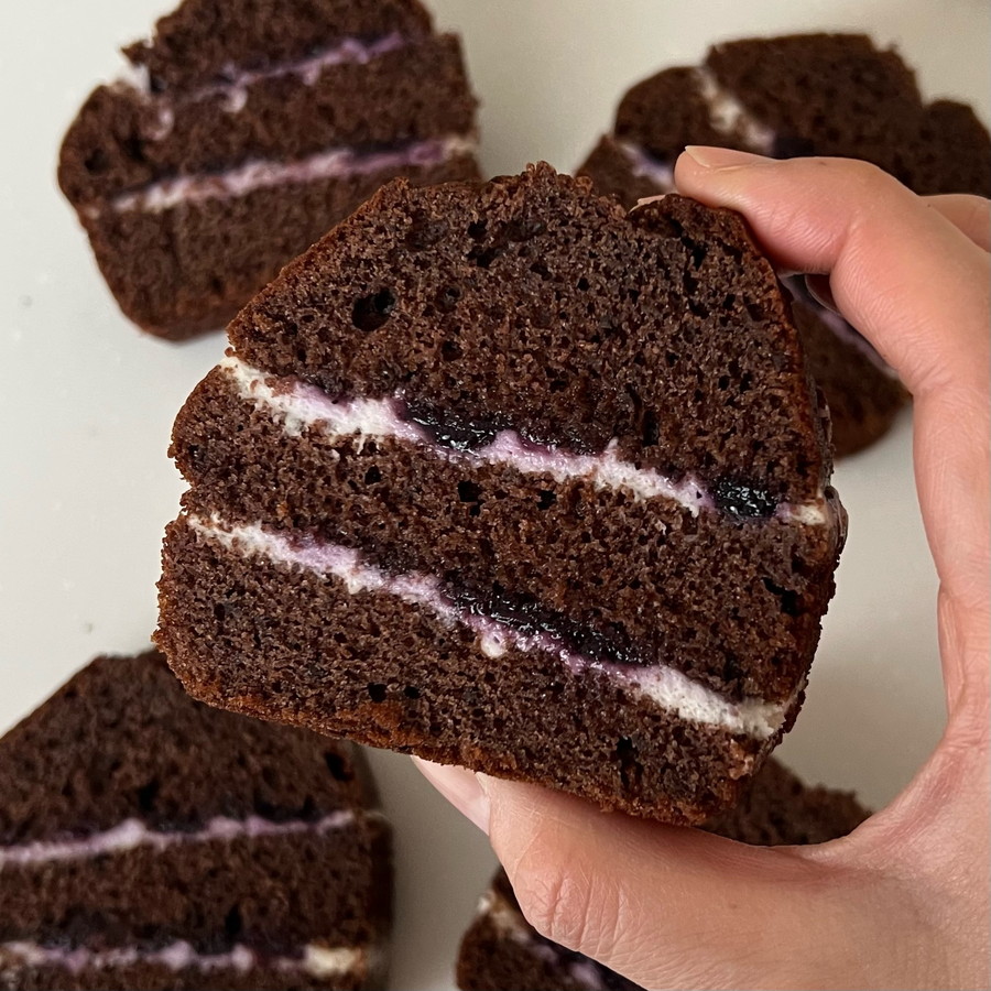 手軽に作れるしっとり濃厚なチョコケーキにホイップクリームとブルーベリージャムをサンドしました。