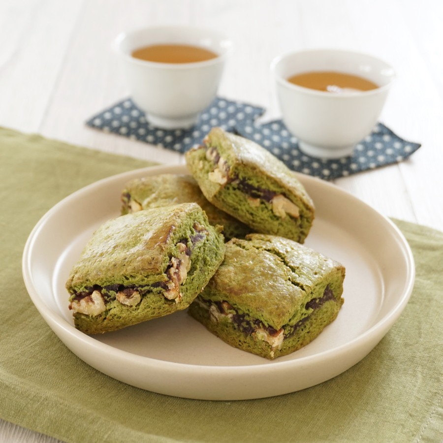 あんことくるみを抹茶のスコーン生地で挟みました。