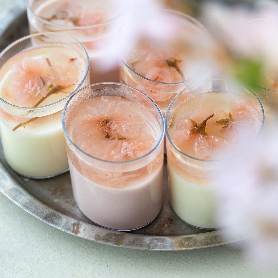 それぞれに桜の花を浮かべたゼリーを重ねて、春らしいデザートを作りましょう。