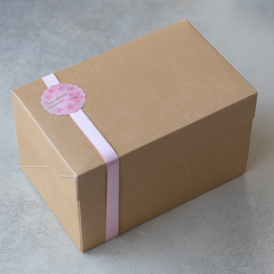 箱を閉じ、リボンを回しかけ、テープでとめる。