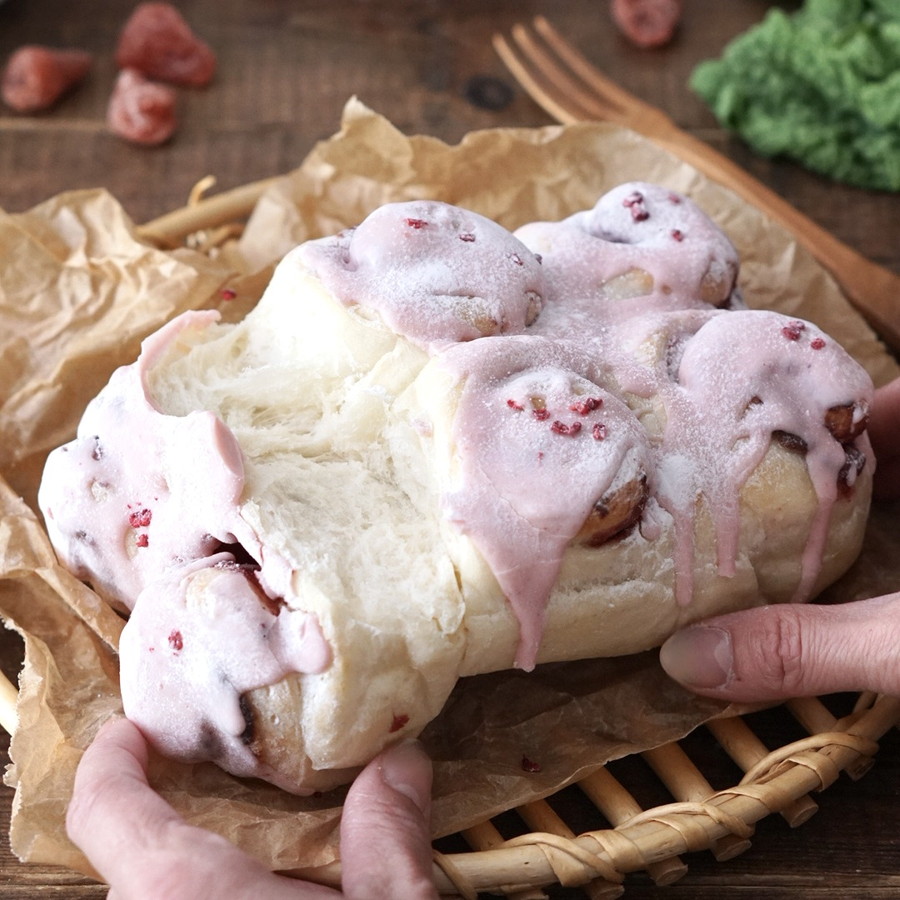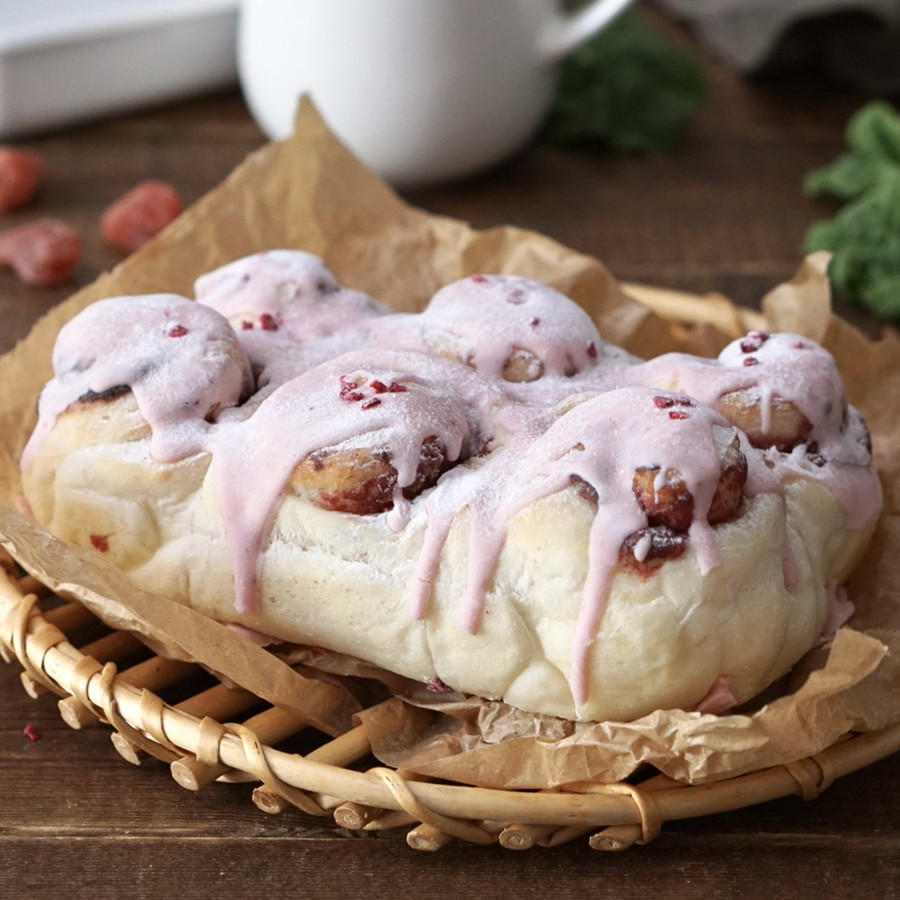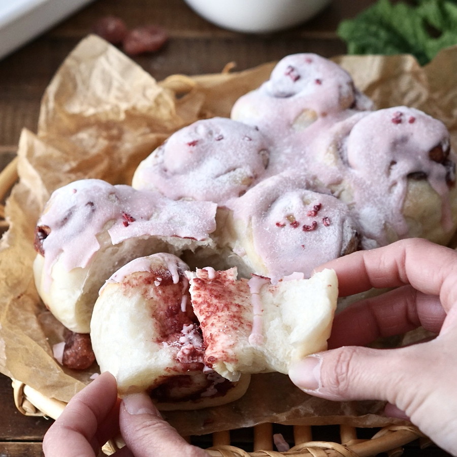 いちごジャムでは甘すぎて苦手な方におすすめ!簡単いちごペーストを塗って巻き込んだちぎりパン。