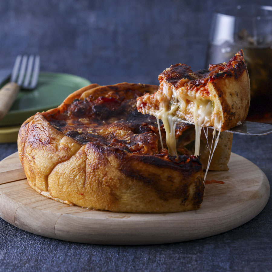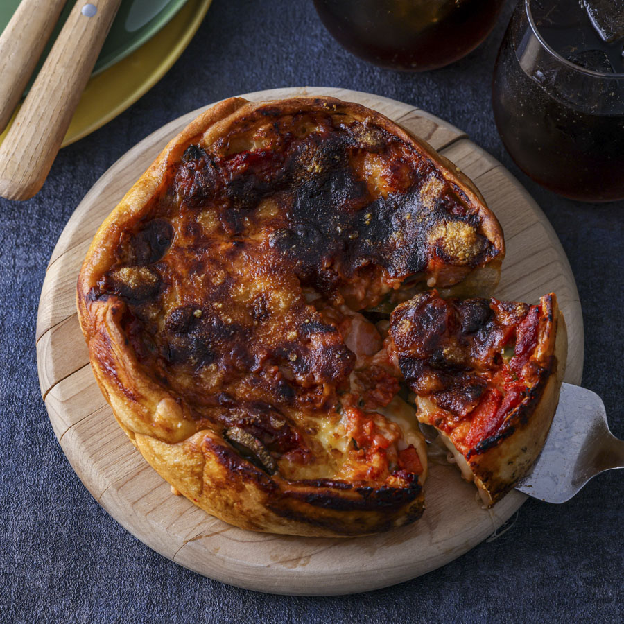 シカゴピザとは、アメリカ・イリノイ州シカゴ発祥の「ディープディッシュスタイル」と呼ばれる厚焼きのピザのこと。