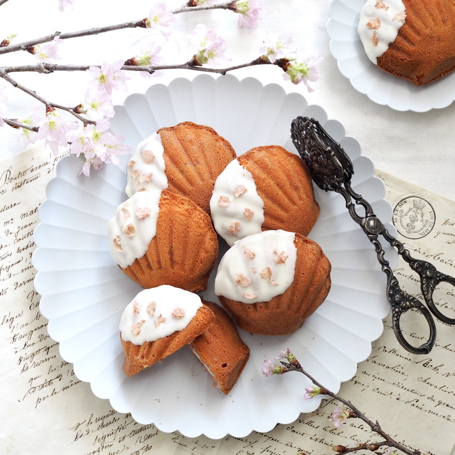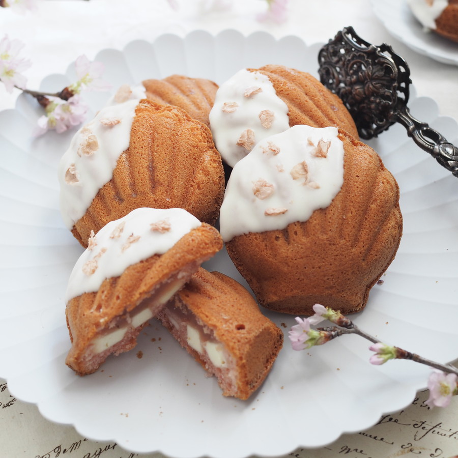 桜生地のマドレーヌの中には桜あんとクリームチーズが入っています。