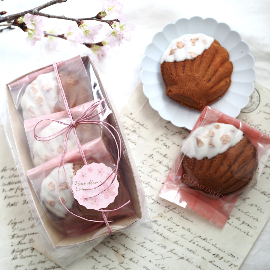 焼き上がりそのまま食べてもおいしいですが、ホワイトチョコに桜の塩漬けで華やかに仕上げています。