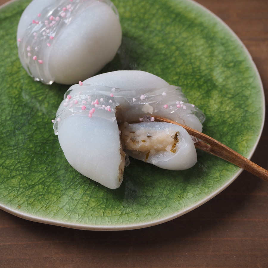 ※外郎は冷めると固くなり包餡できなくなってしまうので、少しずつ仕上げて、残りはラップに包んで蒸し器の予熱や湯煎で温めておきましょう。