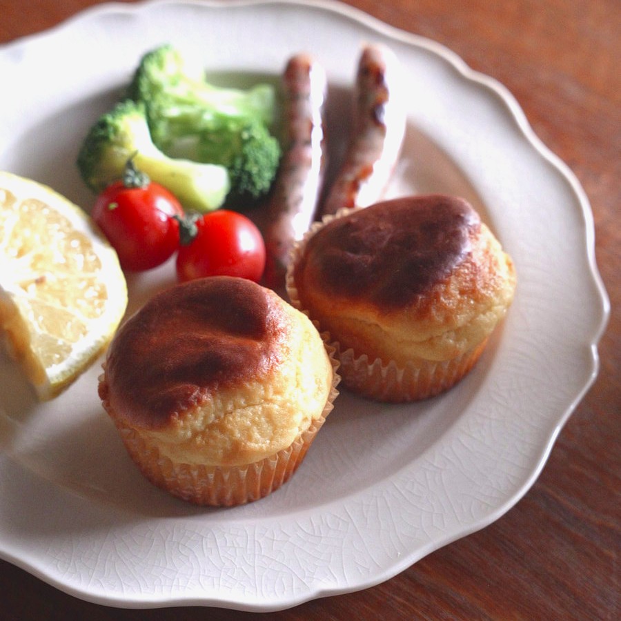 塩気のあるおかずによく合うので、ベーコンやコーンなどを入れてお惣菜マフィンにするのもおすすめです。焼きたてがいちばん美味しいのですが、すぐに食べない場合は、ほんのり温かいうちに一つずつラップで包み、食べる前にレンジで10〜20秒温めるとふわふわに復活します。