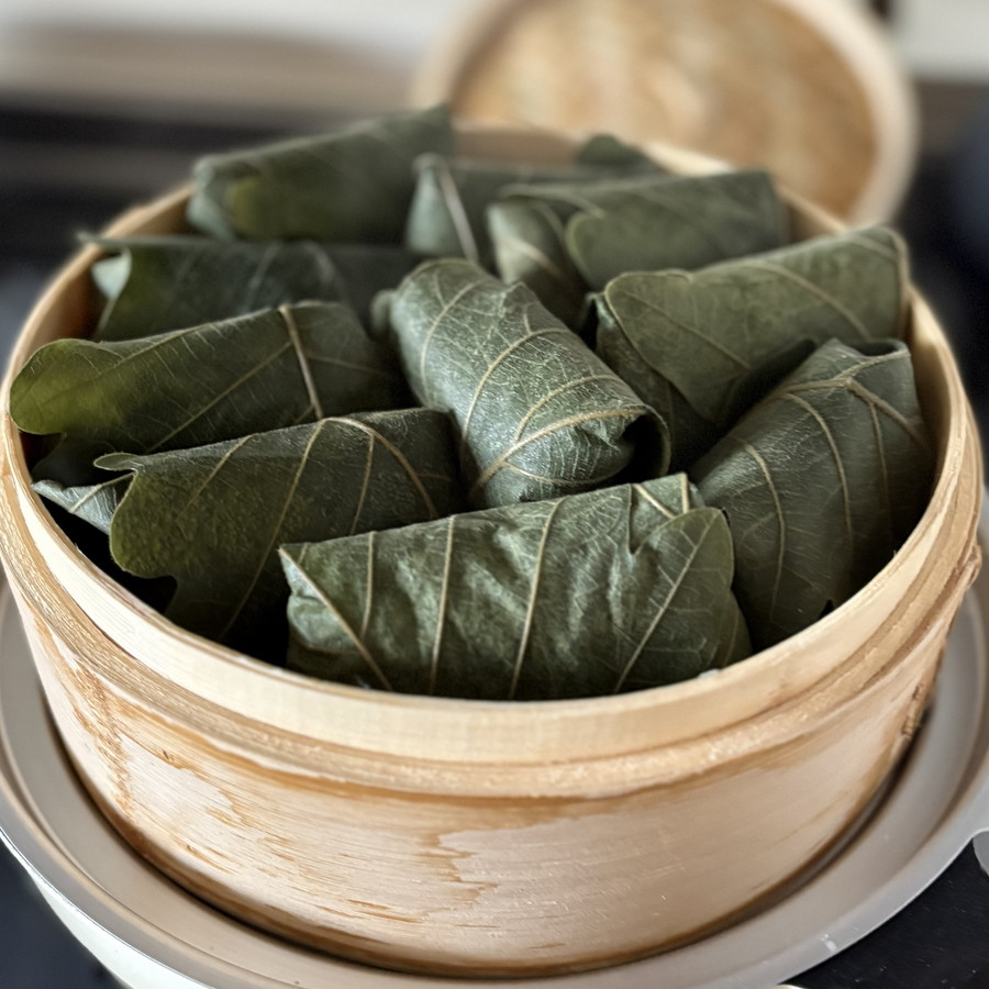 葉で少しずつ包みましたが、数枚を蒸籠に敷いておこわを蒸し、そのまま食卓に出すのもおすすめです。