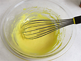 卵黄とグラニュー糖を合わせ湯せんし、ホイッパーでもったりするまで混ぜ合わせる。