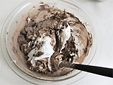 (1)と(3)を合わせ、メレンゲの半量を加え混ぜ合わせる。