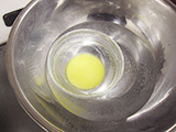 撹拌しながら湯煎にかける。グラニュー糖が溶け、人肌より熱い程度になったら湯煎から外す。
