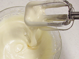 (2)をハンドミキサーで白くもったりとするまで泡立てる。