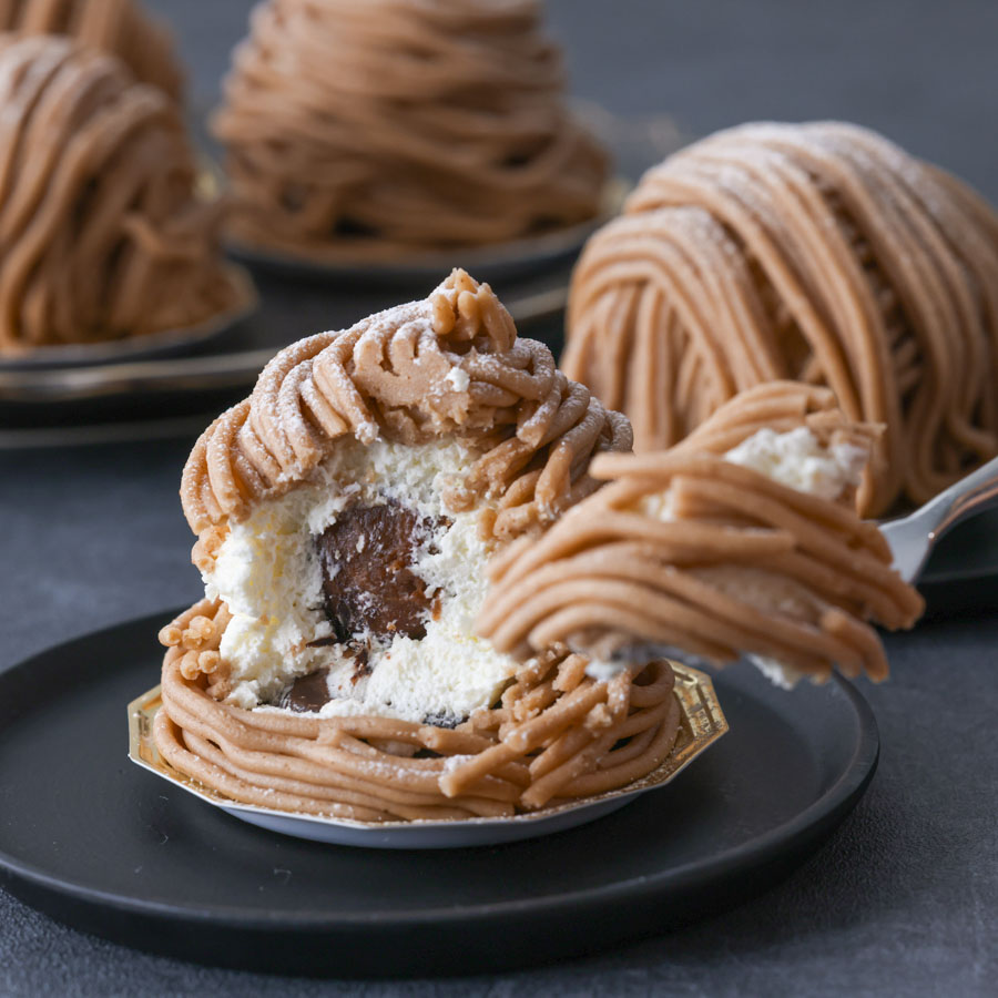 高品質なマロンペーストと栗渋皮煮を丸ごと1粒使用した贅沢なモンブラン。甘さを抑えてラム酒を効かせた本格パティスリー仕様です。