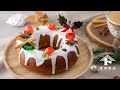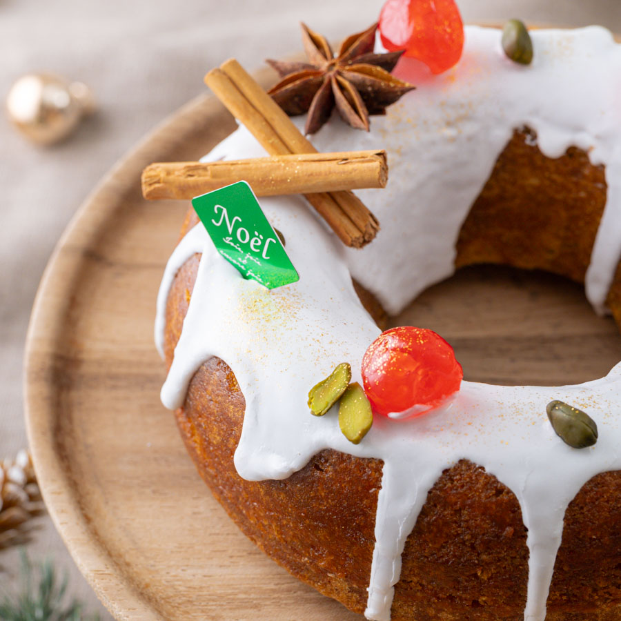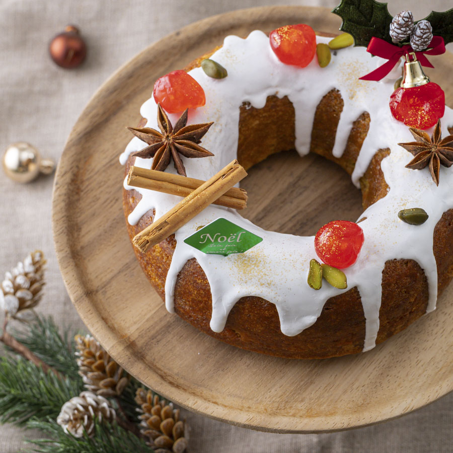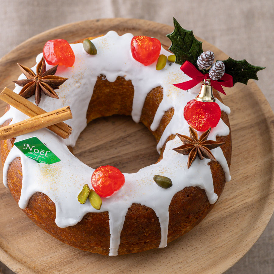 コクのあるピスタチオ生地と酸味のチェリーコンポートを組み合わせたケーキです。エンゼル型は真ん中が開いていることで火の通りが良く、できあがりは丸いリースの形でクリスマスにおすすめです。