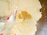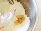 窪みを作り、イーストを加え、少量の水で溶かした後に全体をざっと混ぜ合わせる。