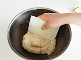 ひとまとまりになるまでボールの中でこね合わせたら、ボールから取り出し、作業台の上で捏ねる。