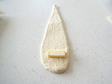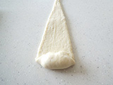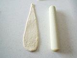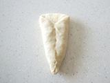 とじ目を上にし、厚みの均一な二等辺三角形ができるように麺棒をあてる。