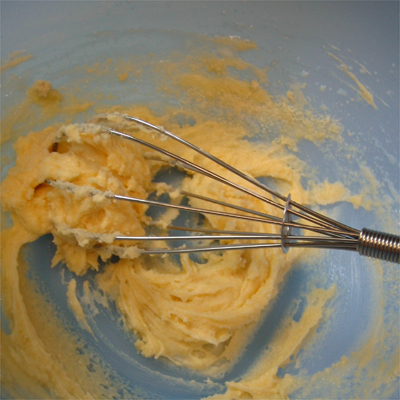 バターをすりまぜ、粉糖、牛乳、アーモンドプードル(アーモンドパウダー)を順に加えまぜる。